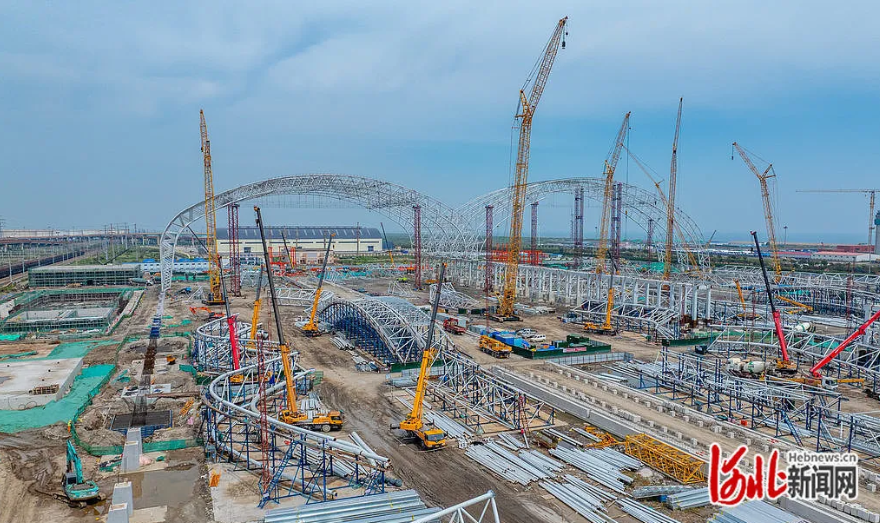 9月21日,曹妃甸矿石储运物流项目建设现场,工人们正在进行料棚搭建