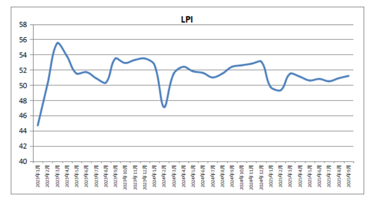 中国物流与采购联合会发布的2025年9月份中国物流业景气指数为51.2%,环比回升0.3个百分点。9月份供应链上下游产供销有效衔接,物流需求增长平稳,服务价格总体稳中有升,企业经营内生动力较好。连续3个月数据来看,物流需求侧相关指标持续保持扩张区间,物流景气指数累计回升0.4个百分点,业务总量指数和新订单指数累计分别回升0.4和0.9个百分点,企业经营活力趋稳,物流服务价格指数、从业人员指数、主营业务利润指数连续回升。