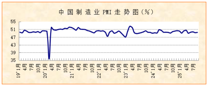 国家统计局服务业调查中心、中国物流与采购联合会发布的2025年9月份中国制造业采购经理指数(PMI)为49.8%,较上月上升0.4个百分点,连续2个月上升。结合分项指数以及分行业指数变化来看,市场需求趋稳恢复,企业生产加快扩张,新动能继续较快增长,消费品制造业短期较好扩张,市场价格积极变化正在酝酿,大型企业稳中有增,小型企业降势收窄。综合来看,宏观经济稳中向好,市场活力趋于上升。