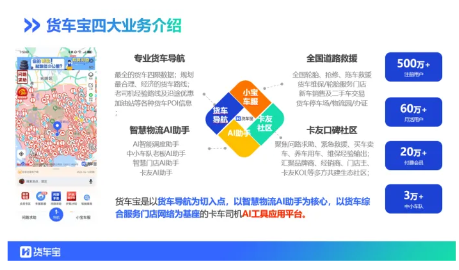 货车宝是一家以货车导航为切入点,以智慧物流AI助手为核心,以货车综合服务门店网络为基座的卡车司机AI工具应用平台,2025年在北京推出相关服务方案,现有500万+注册用户、60万+月活用户、30万+付费会员及3万+中小车队用户。