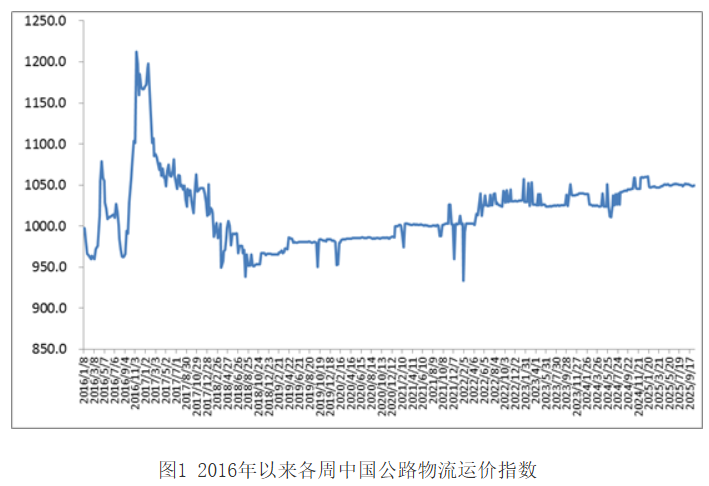 本周(2025年10月13日-2025年10月17日),由中国物流与采购联合会和林安物流集团联合调查的中国公路物流运价指数为1049.43点,比上周回升0.01%。