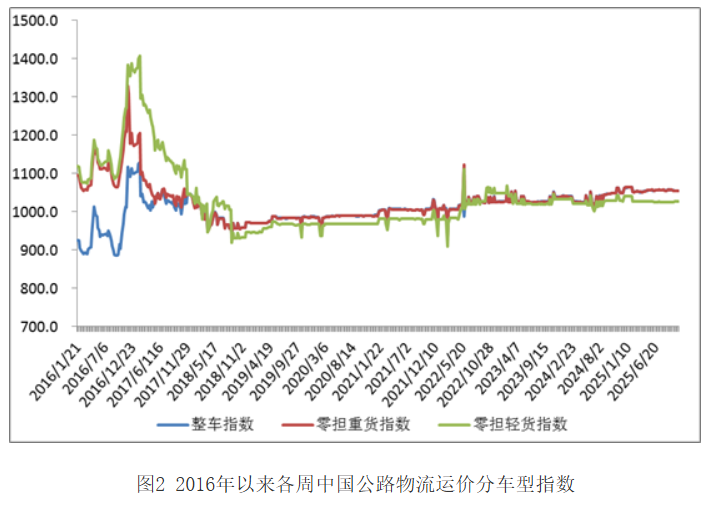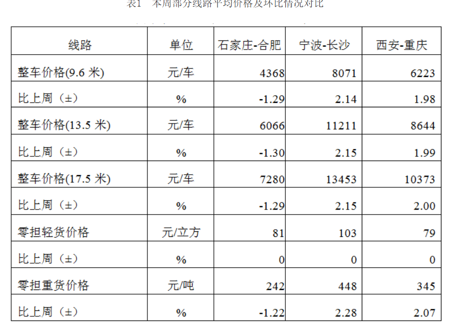 分车型看,各车型指数环比涨跌互现。其中,整车指数为1054.71点,比上周回落0.01%;零担轻货指数为1026.19点,比上周回落0.03%;零担重货指数为1055.37点,比上周回升0.08%。