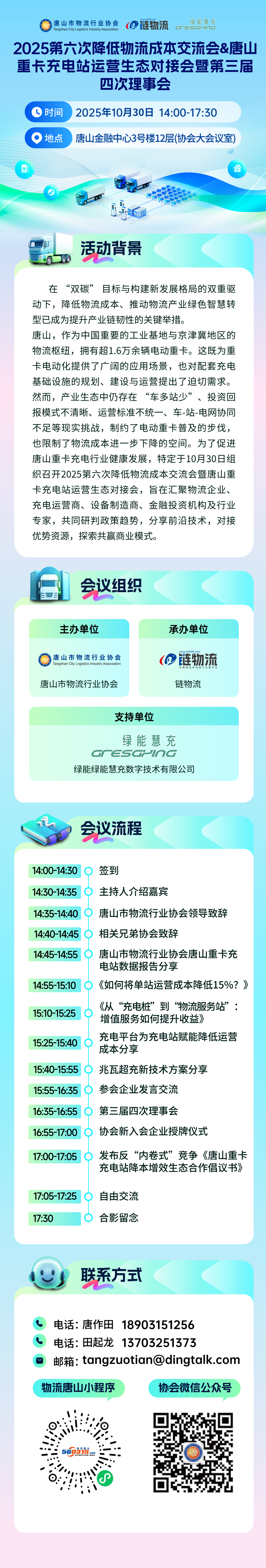 近日,备受业界关注的“物流降本,绿动未来唐山重卡充电站运营生态对接会”已正式启动报名,活动旨在构建一个高效的产业协作平台,聚力推动区域物流运输的绿色化与智能化发展。