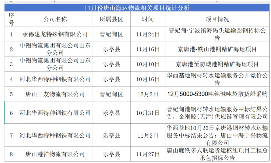 11月份,唐山市共记录6个海运物流相关项目,涉及曹妃甸区、乐亭县两个主要沿海县区。项目类型涵盖钢材运输、铜精矿海运、纯碱船运及多式联运枢纽建设等。
