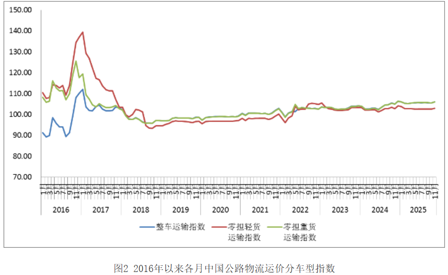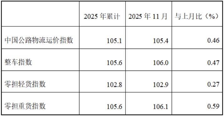 2025年11月份,由中国物流与采购联合会和林安物流集团联合调查的中国公路物流运价指数为105.4点,环比回升0.46%,同比去年回升0.82%。从月内看,本月各周运价指数环比均有所回升。