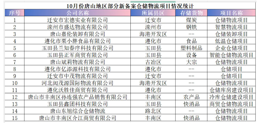 分析:11月份新备案项目数量较10月份增加3个,增幅为20%,反映唐山地区仓储物流项目备案在11月份有所提升,市场活跃度增强。