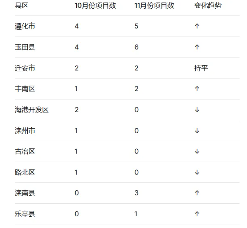 玉田县、遵化市在两个月内均为备案项目较多的区域,且11月份项目数量进一步增加,显示这两个县区在仓储物流建设方面持续发力。