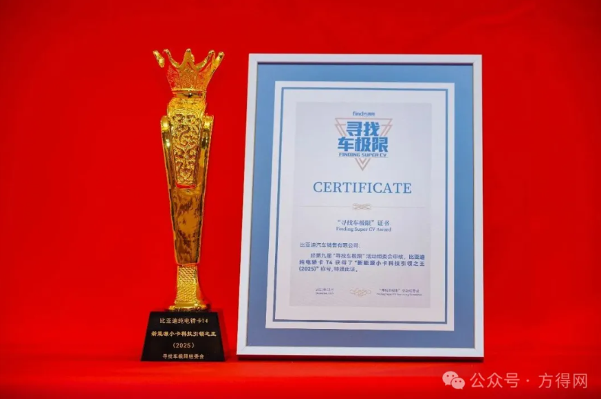 经过寻找车极限组委会调查组实地调查和专家团审核,2025年12月10日,比亚迪纯电轿卡T4在第九届“寻找车极限”颁奖礼,荣耀获得2025“新能源小卡科技引领之王”称号!