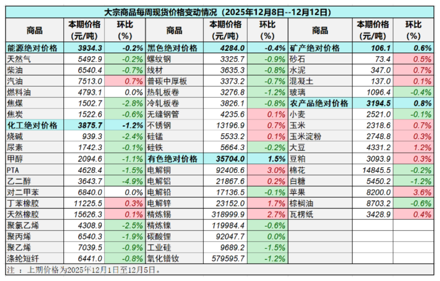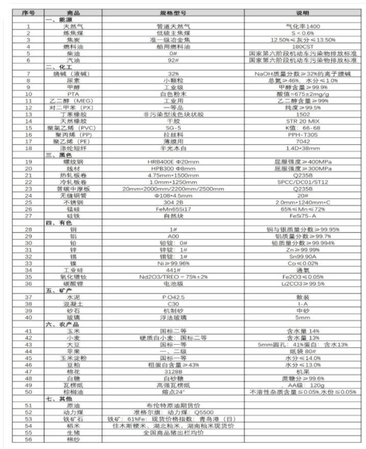 本表所示大宗商品价格(类别与产品规格说明见附表)为以人民币计价的现货价格(包含流通费用、利润和税费等)。计算这些价格时使用的信息来源,主要包括国内重点地区的生产商、贸易商及下游消费企业之间的成交、询报盘及可成交价格。价格单位为人民币元/吨。