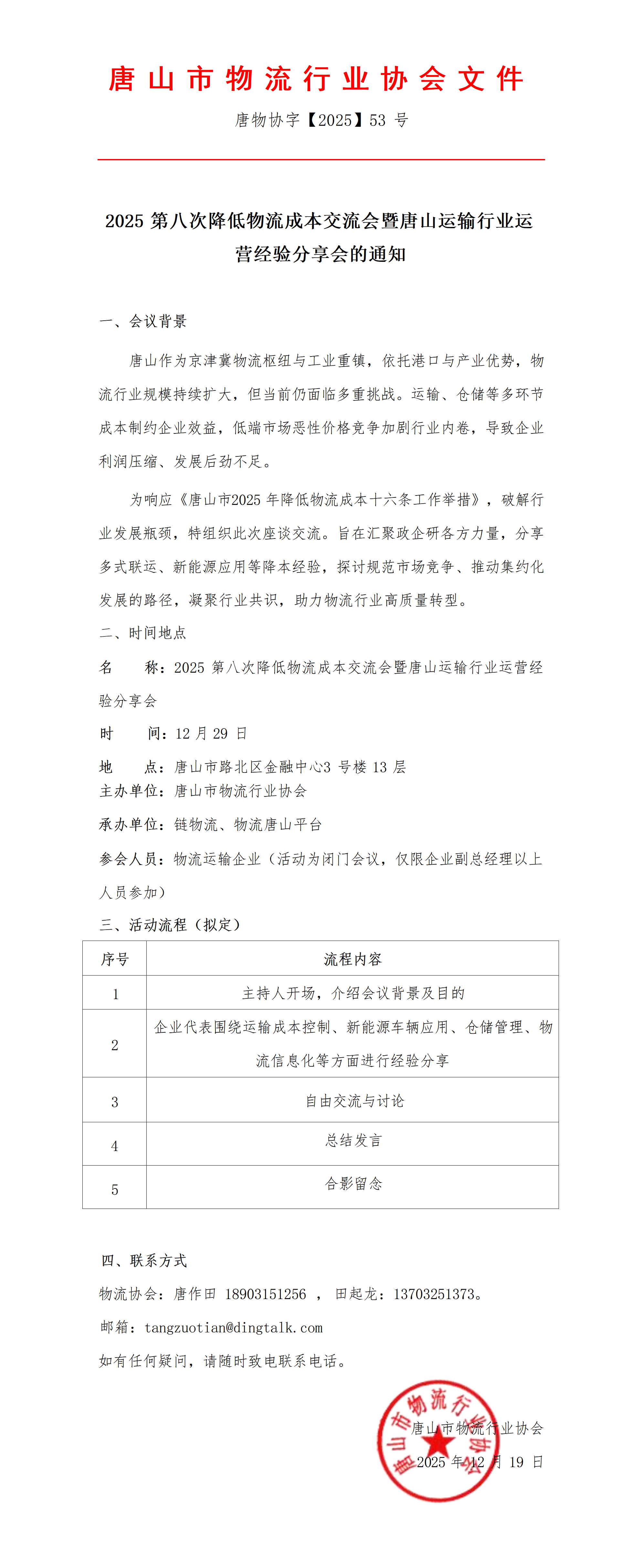关于组织召开2025 第八次降低物流成本交流会暨唐山运输行业运 营经验分享会的通知
