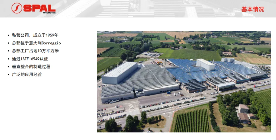 SPAL 成立于1959年,总部位于意大利科雷焦,是一家拥有超过60年历史的私营企业。公司已通过IATF 16949认证,实行垂直整合的制造流程,从模具、注塑到电机与成品组装全程自主可控。目前,SPAL 已在意大利、美国、英国、俄罗斯、韩国、日本、印度、中国、巴西等国家和地区建立了研发、制造与销售网络,形成了覆盖全球的响应与服务能力,2026年更计划在美国新建工厂,持续拓展其全球足迹。