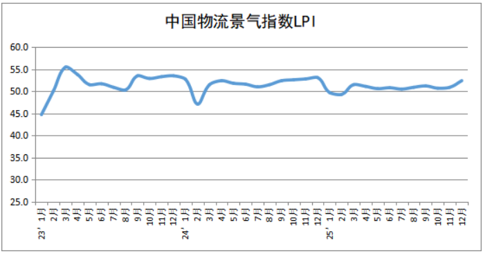 中国物流与采购联合会发布的2025年12月份中国物流业景气指数为52.4%,较上月回升1.5个百分点。