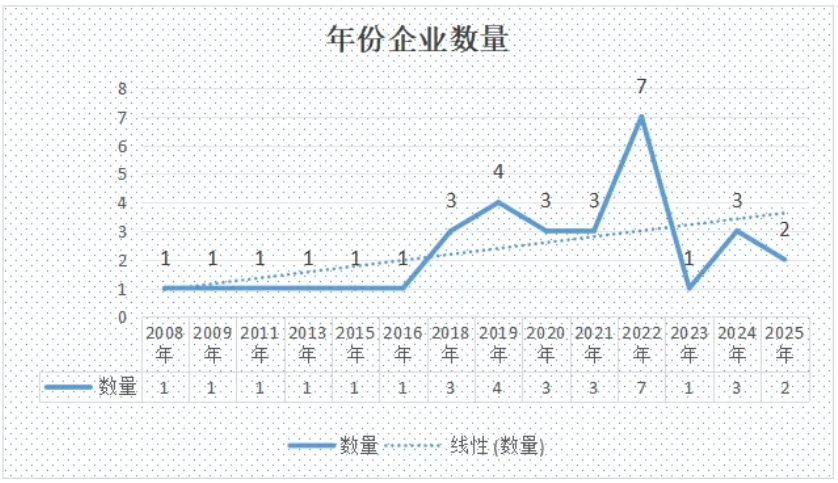从申请的时间来看,2008年、2009年、2011年、2013年、2015年、2016年、2023年都是1家,占比3.13%;2018年是3家,占比9.38%;2019年是4家,占比12.5%;2020年是3家,占比9.38%;2021年是3家,占比9.35%;2022年7家,占比21.88%;2024年3家,占比9.38%;2025年2家,占比6.25%;占比从以上数据可以看出,2022年申报企业最多,同比上涨57.14%,增幅最大。
