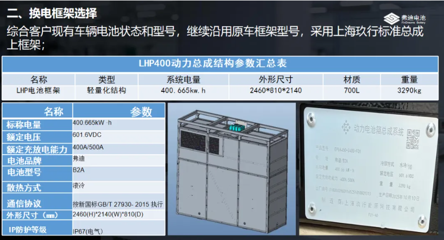 该方案基于客户实际运营工况定制,采用400度电电池配置,搭载B2Apack单包100度电设计,系统总电量达400.665kwh,电压601.6V,容量666Ah,具备高能量密度与强续航能力,可满足长途重卡运输的电力需求。在换电框架方面,方案沿用上海玖行标准上框架,兼容现有车辆结构,实现快速换电与高效部署。