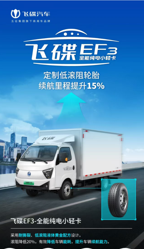 全能纯电小轻卡—飞碟EF3,走街串巷下地库,拉货搬家跑高速,定制低滚阻轮胎,续航里程提升15%。