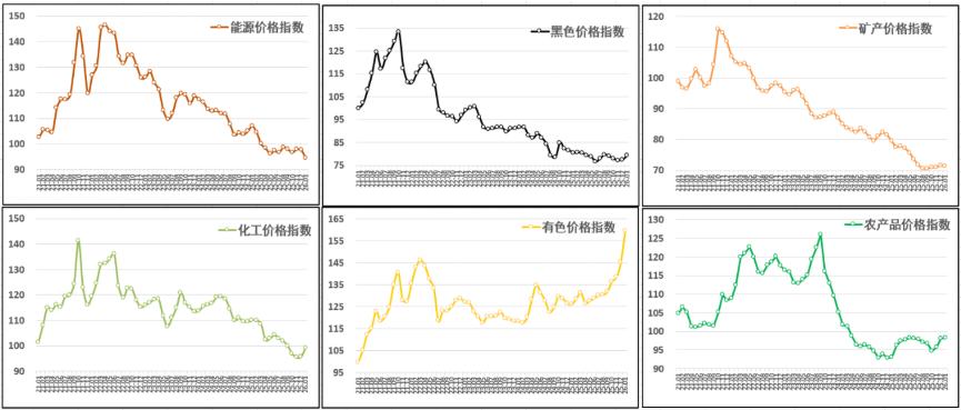 分行业看:有色价格指数大幅上涨,报159.6点,月环比上涨9.9%,年同比上涨26.6%;化工价格指数快速上行,报99.3点,月环比上涨3.8%,年同比下跌9.8%;黑色价格指数继续回升,报79.2点,月环比上涨2.2%,年同比下跌1.6%;农产品价格指数小幅走高,报98.3点,月环比上涨0.2%,年同比上涨5.7%;矿产价格指数小幅回落,报71.3点,月环比下跌0.3%,年同比下跌10.3%;能源价格指数弱势下行,报94.6点,月环比下跌3.2%,年同比下跌11.6%。