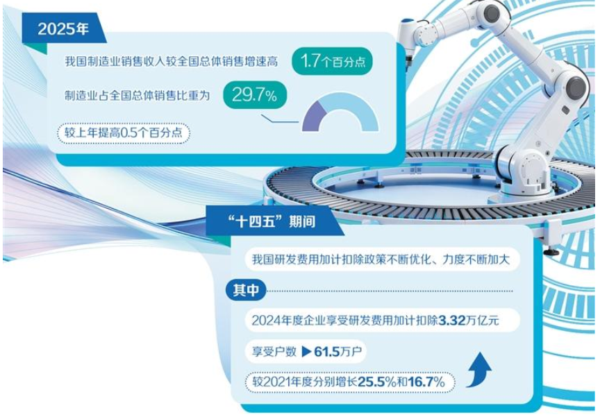 国家税务总局近期公布的数据显示,2025年,我国制造业销售收入较全国总体销售增速高1.7个百分点;制造业占全国总体销售比重为29.7%,较上年提高0.5个百分点,制造业智能化、绿色化、融合化步伐加快,经济“压舱石”作用更加凸显。