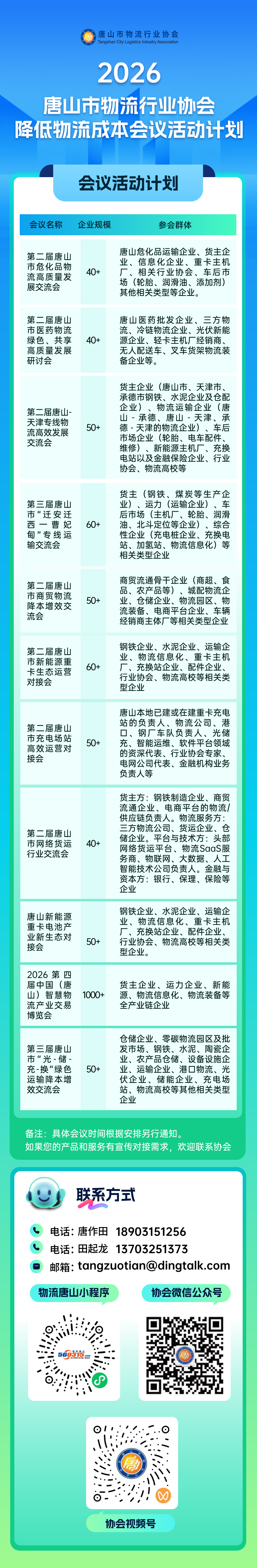 为切实服务企业降低物流成本、提升供应链效率,2026年唐山市物流行业协会将围绕“绿色、智能、协同、共享”主题,计划开展贯穿全年的系列行业会议与对接活动,诚邀行业企业参加。