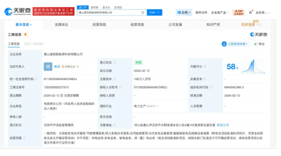 据天眼查显示,唐山龛阳新能源科技有限公司成立于2026年2月12日,注册资本100万元,法定代表人为杨成。由阳光电源旗下合肥春阳新能源投资有限公司全资持股。