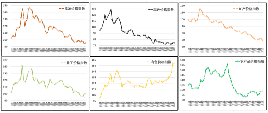 分行业看:化工价格指数继续上行,报100.5点,月环比上涨1.2%,年同比下跌8.7%;能源价格指数小幅反弹,报95.1点,月环比上涨0.5%,年同比下跌9.1%;农产品价格指数略微上涨,报98.4点,月环比上涨0.1%,年同比上涨2.2%;黑色价格指数略有回落,报79点,月环比下跌0.2%,年同比下跌2%;有色价格指数小幅回调,报158.3点,月环比下跌0.8%,年同比上涨23.1%;矿产价格指数继续走低,报69.7点,月环比下跌2.3%,年同比下跌9.9%。