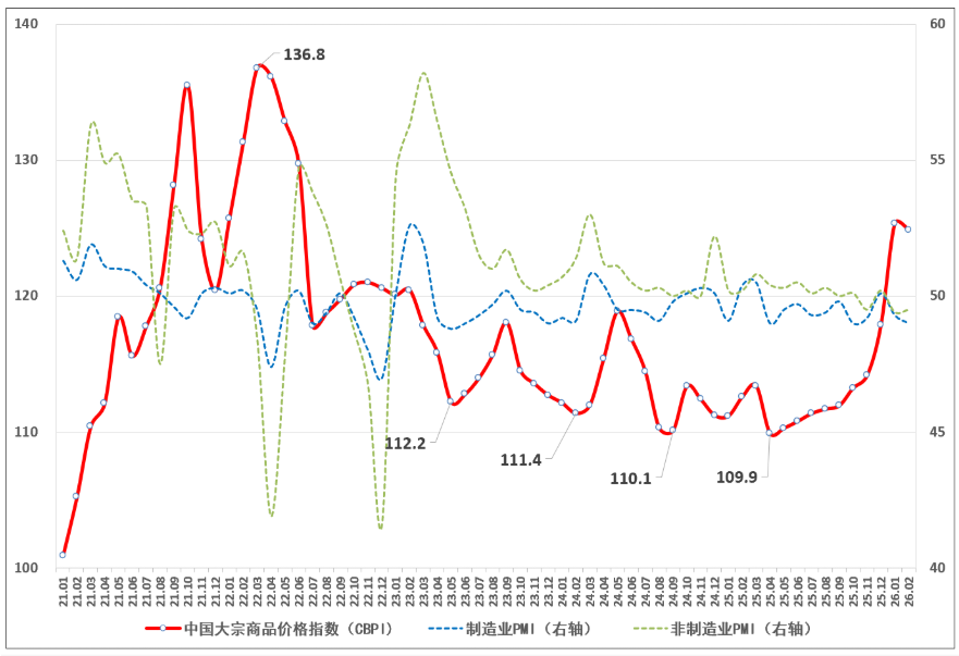 由中物联大宗商品流通分会和上海钢联等单位联合调查,中国物流与采购联合会发布的2026年2月份中国大宗商品价格指数(CBPI)为124.9点,环比下跌0.4%,同比上涨10.9%。从指数运行情况来看,受春节假期影响,环比略有回落,但同比保持近年来较大涨幅,表明大宗商品市场总体运行平稳,市场预期向好的基本趋势和内生动力依然稳固。随节后各行业全面复工复产,以及投资和消费需求释放,市场有望逐步回暖,企稳回升。但当前国际形势复杂多变,金融市场动荡加剧,部分行业需求不足问题仍比较突出,维护大宗商品市场平稳运行,需进一步加强对能源、化工和有色金属等大宗商品的外部输入性风险研判与管控,实施更加积极主动的宏观调控政策。