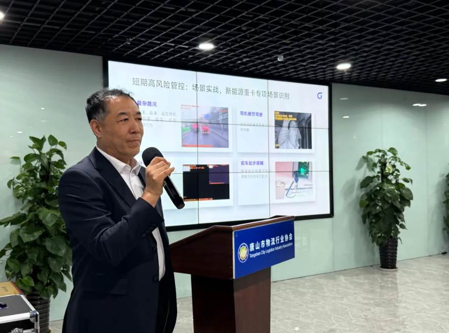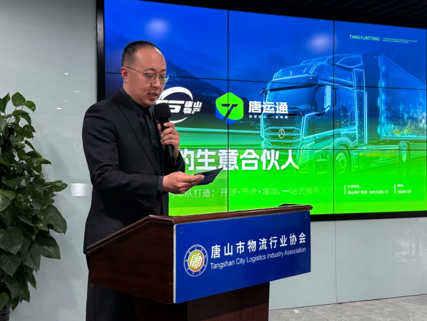在主题分享环节,河北津西钢铁集团股份有限公司高波部长围绕钢铁企业绿色运输发展之路进行了精彩发言,分享了企业在绿色运输方面的实践经验与思考。唐山物产集团绿色交通公司董事长刘鹏、运营经理邵童在会上围绕“唐运通”产业互联网平台核心价值、服务体系与配套支持政策进行权威发布与深度解读。系统介绍平台依托唐山物产集团国企信用与本土产业资源,以开源、节流、增效三大支柱为核心,精准破解物流车队“货源少、成本高、管理烦” 三大行业痛点,全景展示国企平台在推动唐山绿色货运与新能源物流行业转型升级中的责任担当与实践成效,清晰呈现唐运通从降本增效到生态构建的全链条赋能路径,展现平台深耕生产性服务业、助力物流行业转型升级的积极作为。