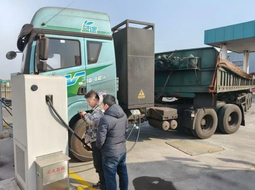 ↑司机张杰(左)操作手机App给重卡充电。