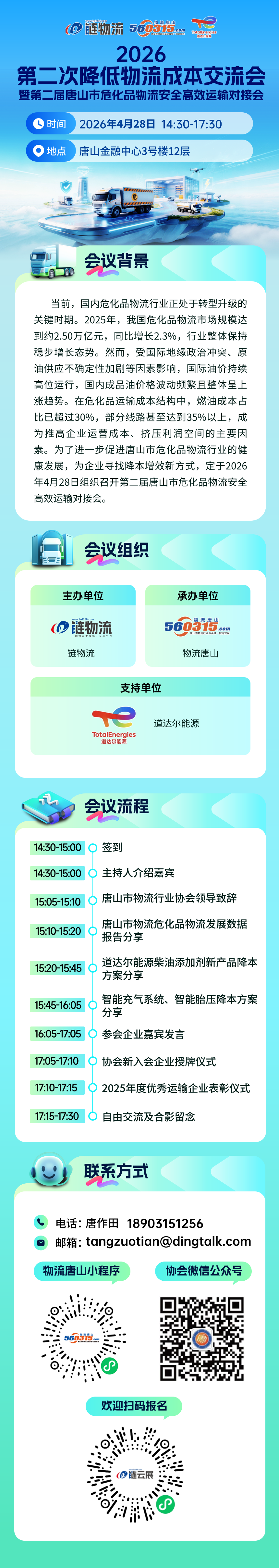 当前,国内危化品物流行业正处于转型升级的关键时期。2025年,我国危化品物流市场规模达到约2.50万亿元,同比增长2.3%,行业整体保持稳步增长态势。然而,受国际地缘政治冲突、原油供应不确定性加剧等因素影响,国际油价持续高位运行,国内成品油价格波动频繁且整体呈上涨趋势。在危化品运输成本结构中,燃油成本占比已超过30%,部分线路甚至达到35%以上,成为推高企业运营成本、挤压利润空间的主要因素。为了进一步促进唐山市危化品物流行业的健康发展,为企业寻找降本增效新方式,定于2026年4月28日组织召开第二届唐山市危化品物流安全高效运输对接会,邀请函如下,诚邀相关企业扫码报名参加。